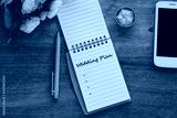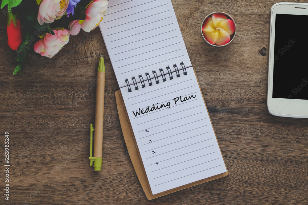 Wedding plan text on book note with cup of coffee, pen and smartphone.