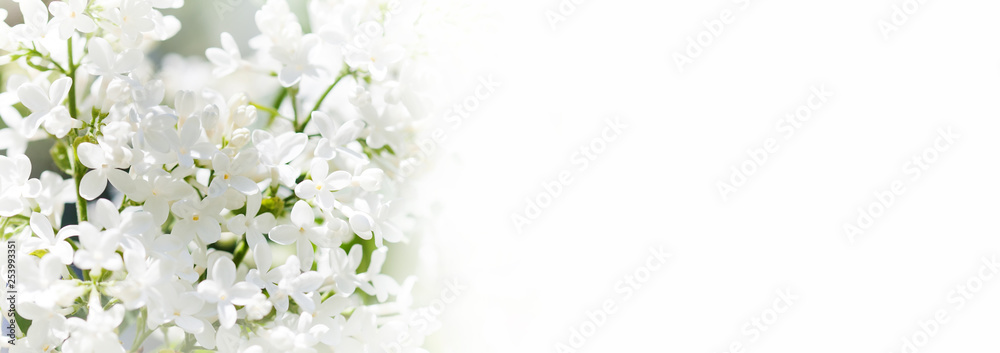 Spring nature background. Blossoming common Syringa vulgaris lilacs bush white cultivar. Springtime landscape with bunch of tender flowers. lily-white blooming plants, copy space.
