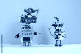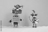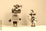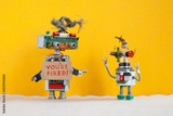 Robot chief dismisses younger robotic employer. Robotic character with a cardboard sign and handwritten text You are fired and small android dissatisfied with loosing vacancy. yellow background.
