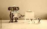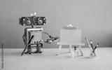 Robot artist begins to create a drawing. White paper mockup, wooden easel and artist's tools palette, pencils case.