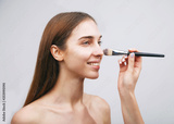 Close up woman getting make up on cheeks, visage concept