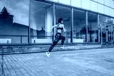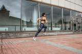 Young athletic girl running morning jog, fitness training, sportswear, leggings and top. Against background glass windows, view side. Phone listens music headphones. Summer city workout. Free space.