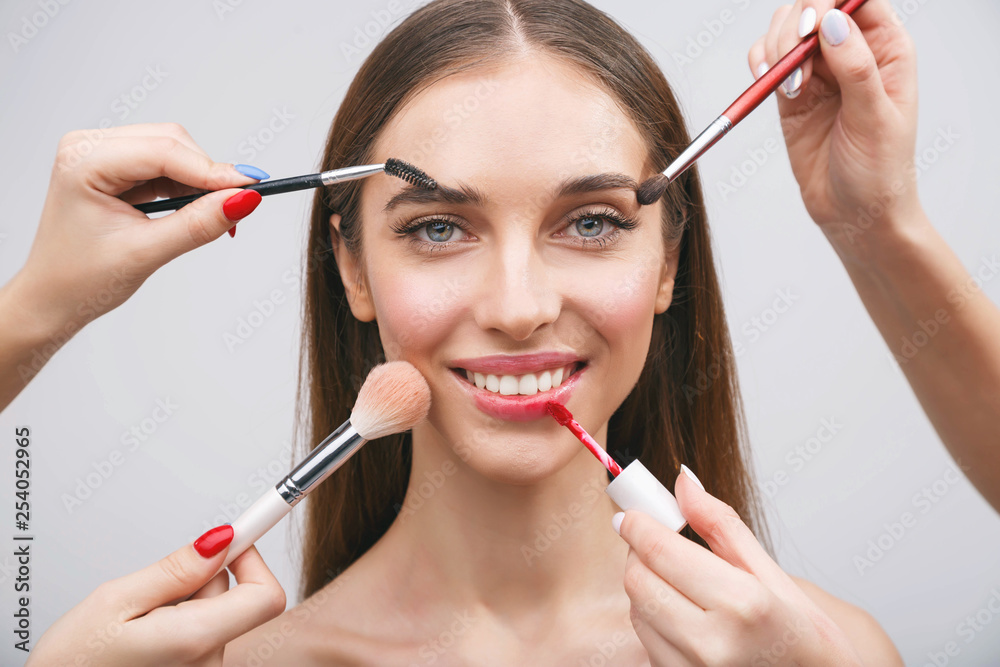 Portrait of a brunette girl getting make-up applied by a makeup with many hands