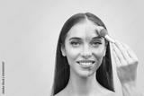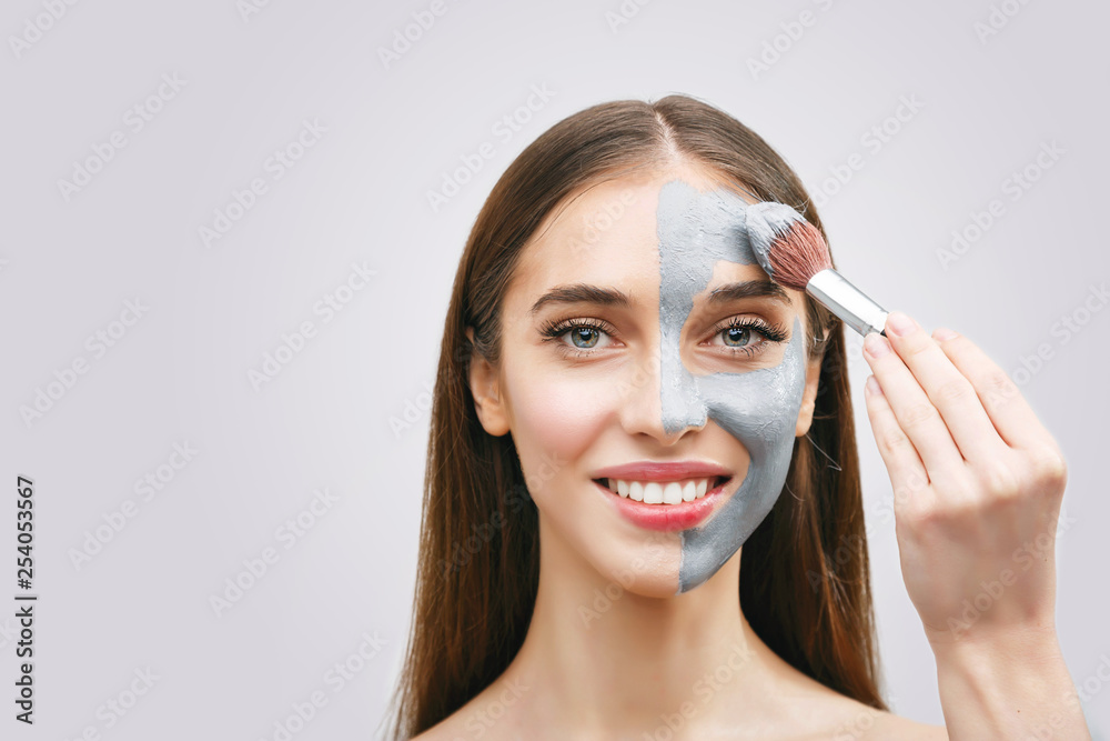 Spa teen girl applying facial clay mask on half of her face