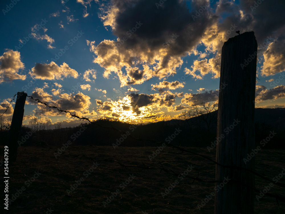 Beautiful landscape in the mountains at sunset. View of colorful sky with amazing clouds.