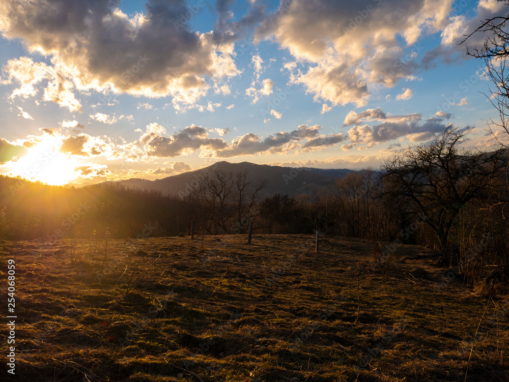 Beautiful landscape in the mountains at sunset. View of colorful sky with amazing clouds.