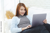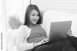 Beautiful Asian woman is smiling.Asian women work with gray laptops on the sofa in the room in the morning.She is happy to get a new job, success, or get good news.