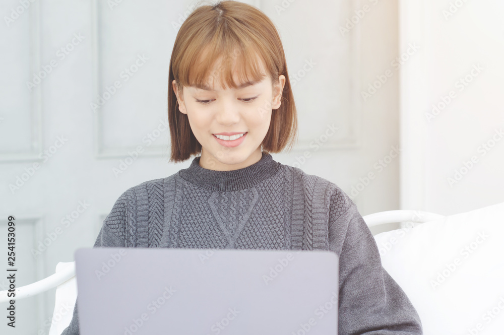 Gray shirt women On a white mattress in the bedroom in the morning.Lady are working on the gray laptop.Beautiful woman smiling..
