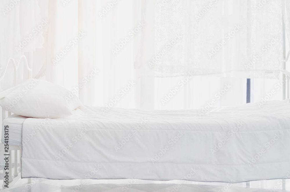 The white bed is in the sun-warmed bedroom in the morning. White bedroom in the morning.Do not focus on objects.