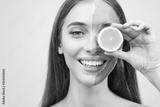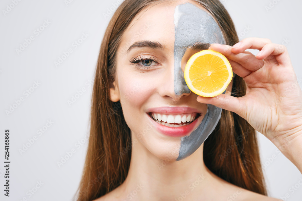 Brunette woman with facial mask holding a slice of lemon in front of her face
