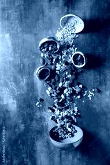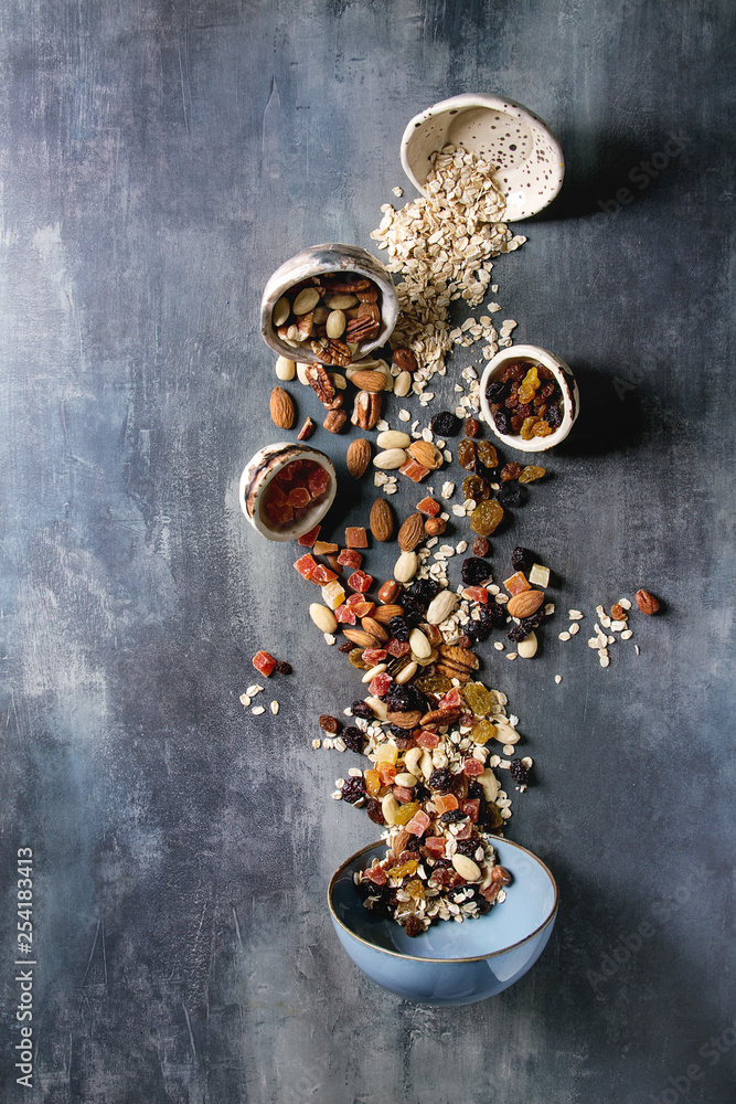 Variety of dried fruits, nuts, honey and oat flakes pours in ceramic bowl for cooking homemade healthy breakfast muesli or granola energy bars over blue texture background. Flat lay, space.