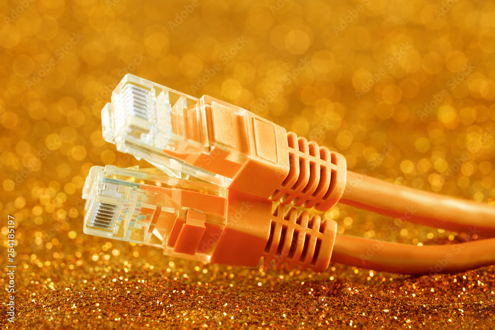Two network cables over orange sparkles background