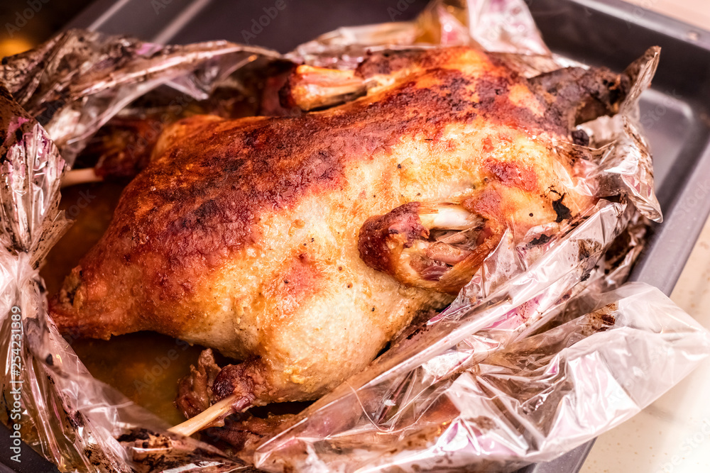 Whole roasted duck on a sheet of oven. Meat for celebration, holiday