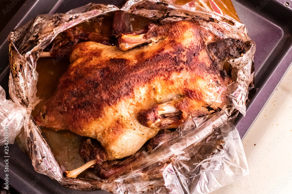 Whole roasted duck on a sheet of oven. Meat for celebration, holiday. View from above