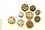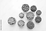 Green plants, different colors succulents, in cement concrete pots stand in a row on a white background. The concept of a flower shop, gifts for women and the protection of nature.