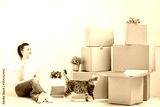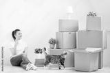 A young beautiful brunette girl in a white T-shirt is sitting on the floor of a bright room and making calls on her smartphone. Around cardboard boxes and a cat.