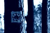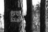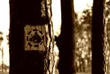 Tree with a white horse road sign painted on it