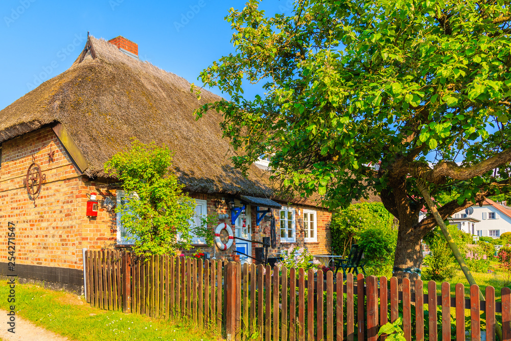 Traditional rustic house with straw roof in Seedorf village, Rugen island, Baltic Sea, Germany