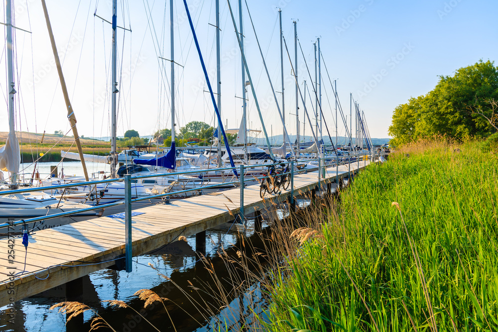 SEEDORF PORT, RUGEN ISLAND - MAY 27, 2018: Sailing boats anchoring in beautiful marina on coast of Rugen island, Baltic Sea, Germany. It is very popular tourist destination in summer season.