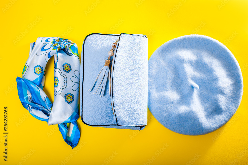 Spring female clothes and accessories. Stylish handbag with blue beret and scarf. Fashion