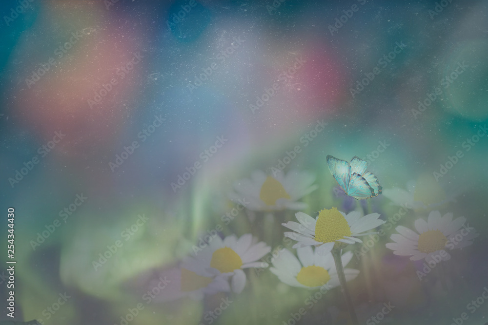 Butterfly in the chamomile on a meadow at night in the shining moonlight on nature in blue and purple tones, macro. Fabulous magical artistic image of a dream, copy space.