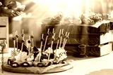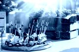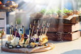 Beautifully decorated catering banquet table with different food snacks and appetizers with sandwich at sunny day