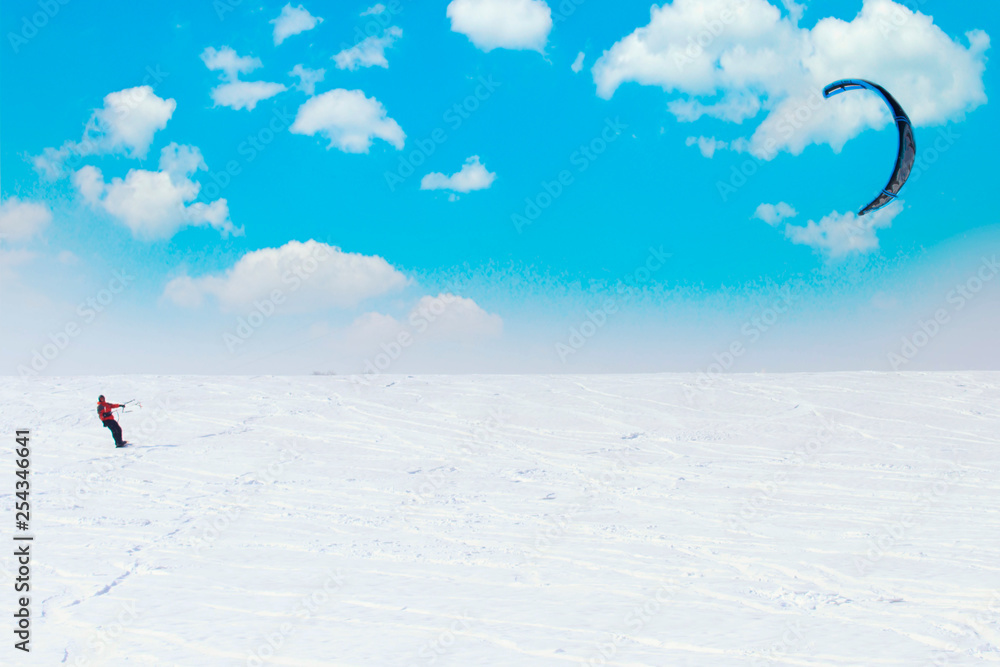 Snowboarder with kite on free ride on blue sky background