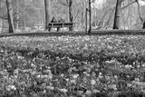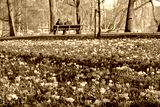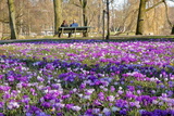 Blooming Crocuses in Oosterpark, Amsterdam, Netherlands, with a couple enjoying the park in the background