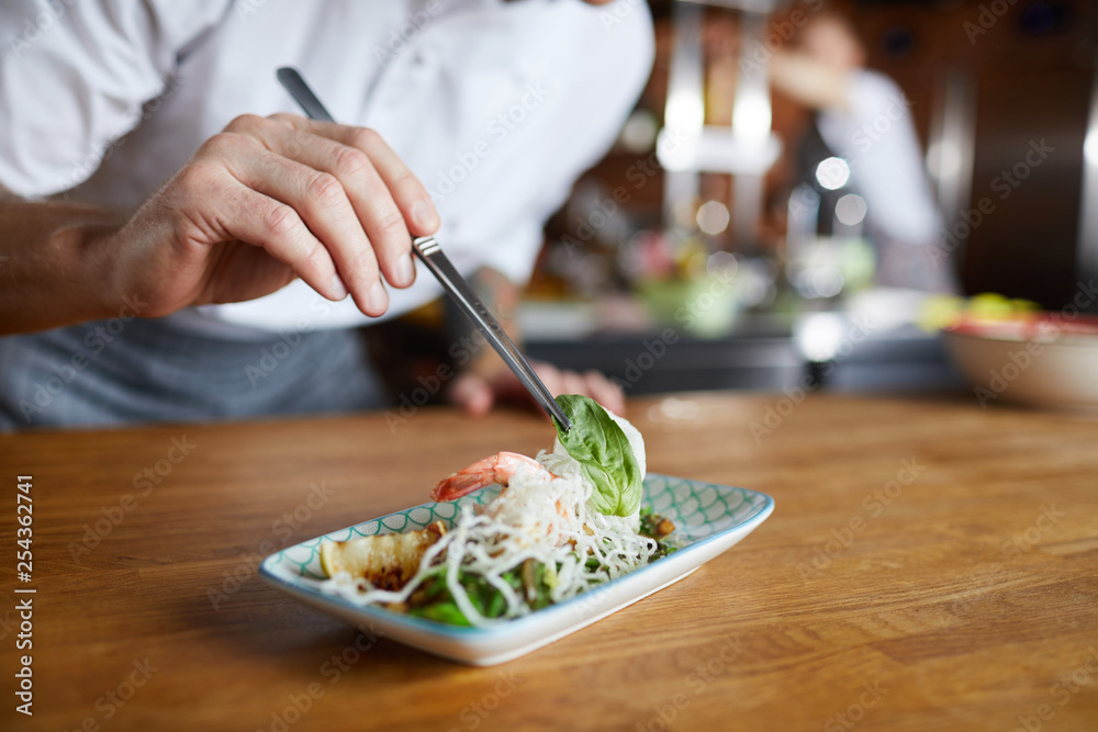 Closeup of professional chef plating Asian seafood dish in restaurant kitchen, copy space