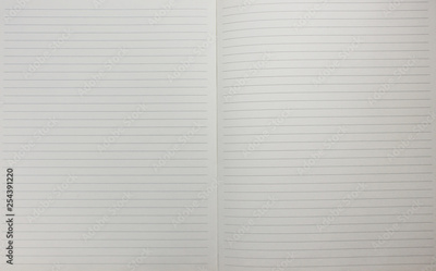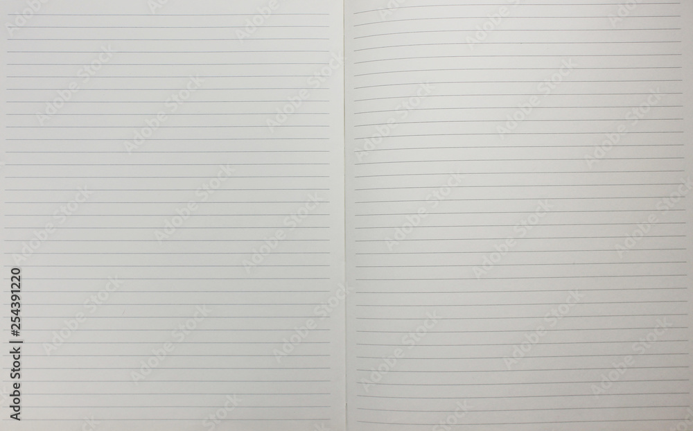 Notebook with empty open lined paper pages top view. Blank white paper sheets and notepad background for writing text. Education note book empty template