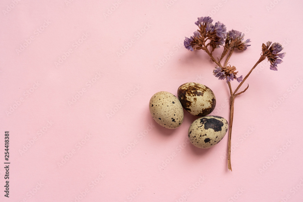 Easter quail eggs with dried flower isolated on pink background. Spring and Ester holiday greeting card concept. Top view. Flat lay. Copy space