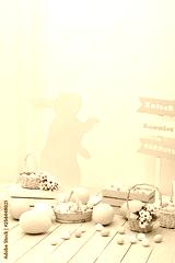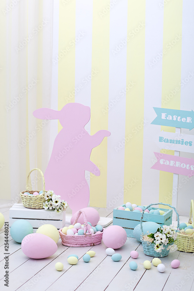 Easter! Many colorful Easter eggs with bunnies and baskets of flowers! Easter room decoration and decor, children's playroom. Colorful painted Easter eggs and colorful rabbits.