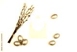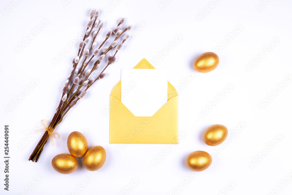 Golden colored Easter eggs, blank card in opened golden envelope and willow catkins bouquet on white background. Place for text.