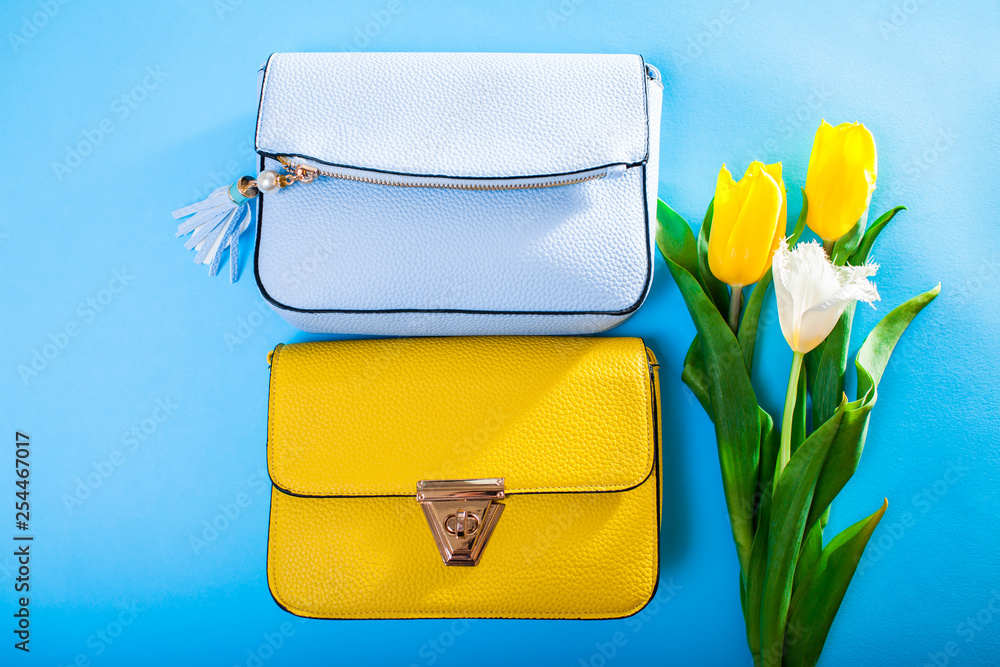 Spring female accessories with tulips. Stylish yellow and blue handbags with flowers. Fashion