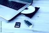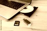 SD Card, Flash Drive USB3.0 and CD DVD Drive Writer Burner Reader of laptop computer on wooden background, Concept of Data storage device