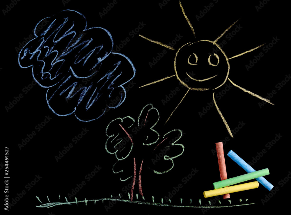 Colorful chalks and children's drawing of the sun and tree made with chalks isolated on black background