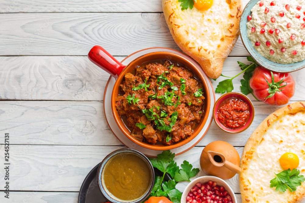 Georgian cuisine- Adjarian Khachapuri with cheese sulguni, chashushuli - a beef and tomato stew, Pkhali from eggplants and walnuts, adjika, Tkemali souse.