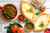 Georgian cuisine- Adjarian Khachapuri with cheese sulguni, chashushuli - a beef and tomato stew, Pkhali from eggplants and walnuts, adjika, Tkemali souse.