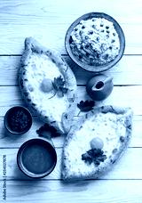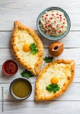 Adjarian Khachapuri is a traditional Georgian dish of sulguni cheese-filled bread with egg yolk.
