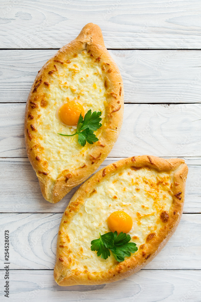 Adjarian Khachapuri is a traditional Georgian dish of sulguni cheese-filled bread with egg yolk.