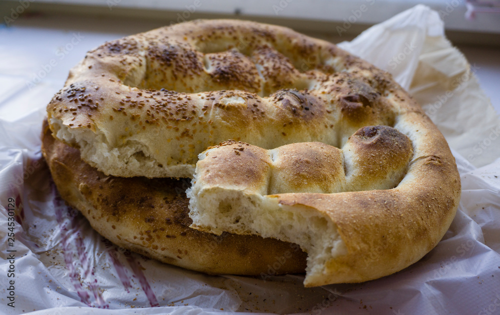 Close up of Turkish Ramadan Pita. bread. Traditional Ramadan food as known Ramazan Pidesi (Pide). Turkish bread with sesame and nigella seeds. Happy Ramadan Kareem or Ramadan Mubarak concept photo.