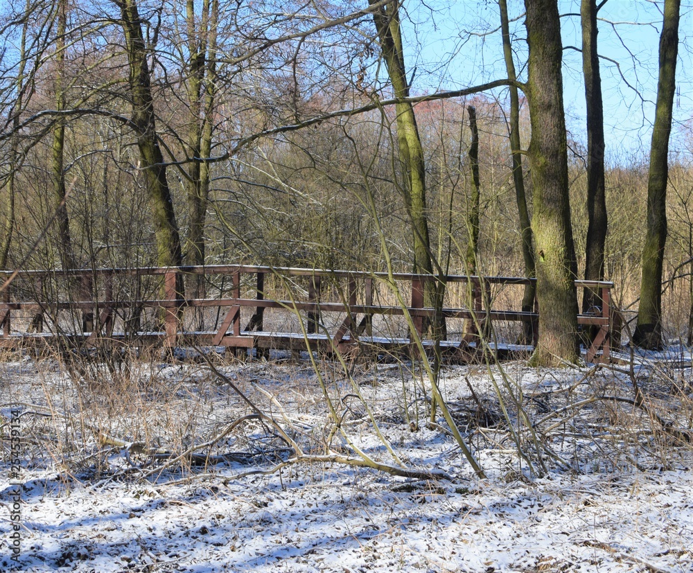 Mostek w lesie bokiem poziomo