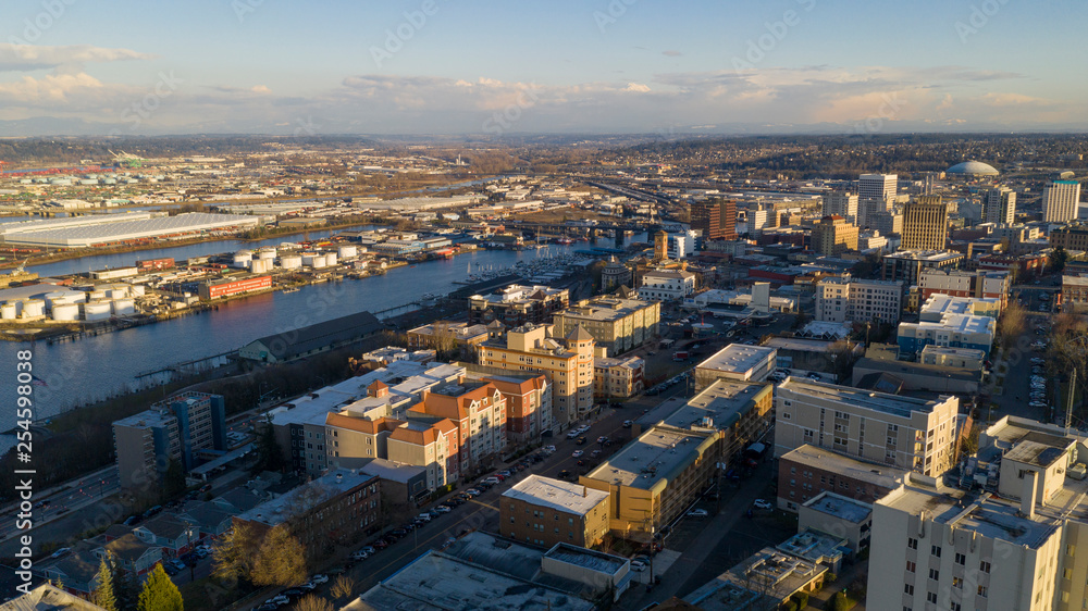 Aerial View Over Downtown Tacoma Washington Thea Foss Waterway