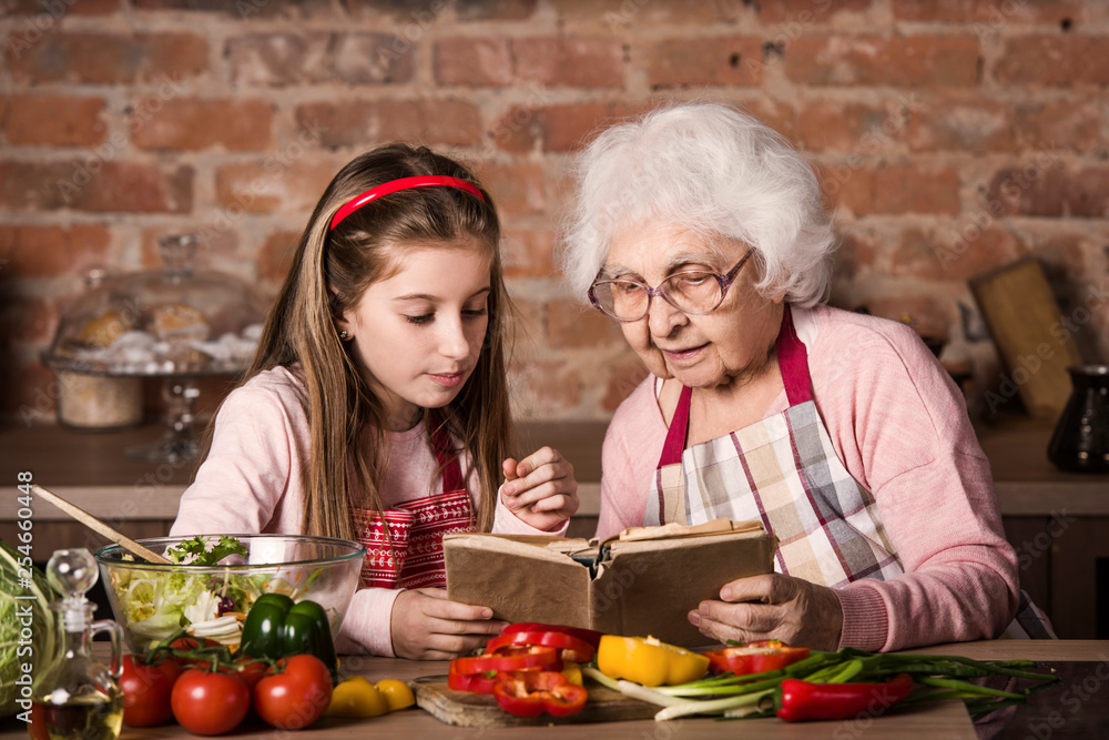 Grandmother and her cute granddaughter searching for a recipe in old cooking book