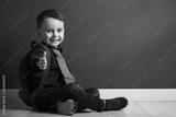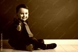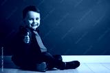 child getting ready for school. Sits on the floor with a backpack with a very happy face