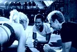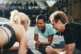 Smiling friends planking together during a gym workout class