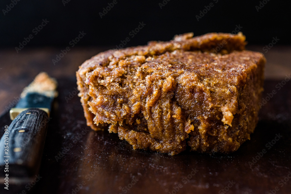 Organic Date Fruit Paste Dough on Dark Wooden Surface.