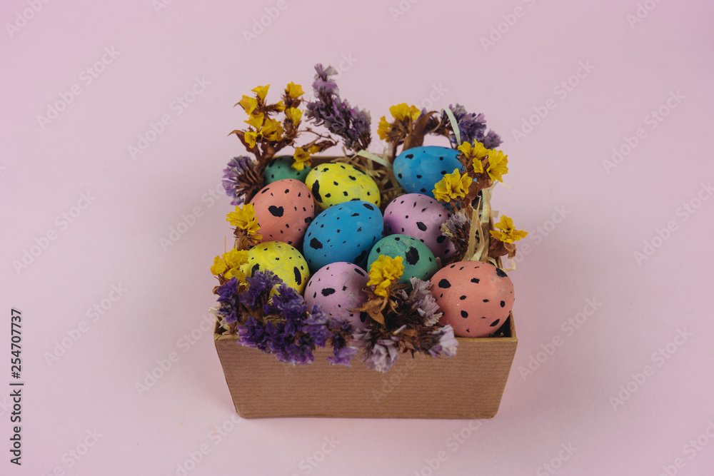 Beautiful painted Easter eggs with dried flowers in little box isolated on pink background. Quail eggs. Easter decoration holiday concept. Top view. Trendy