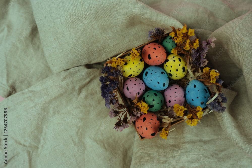 Beautiful painted Easter eggs with dried flowers in little box on linen cloth background. Quail eggs. Easter decoration holiday concept.