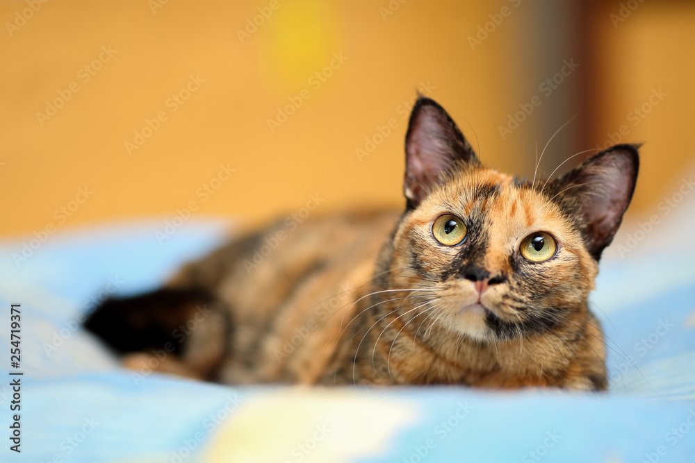 Close portrait of a beautiful tortoiseshell cat with big, round dichromatic eyes (yellow and green colored) eyes lying on a bed looking upwards